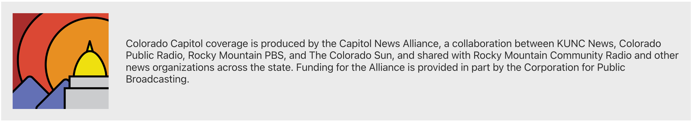 In late 2024, the Capitol News Alliance launched as a collaboration between KUNC News, Colorado Public Radio, Rocky Mountain PBS, and The Colorado Sun. Content is shared with RMCR stations for local distribution, along with other news organizations across the state. Funding for the Alliance is provided in part by the Corporation for Public Broadcasting.